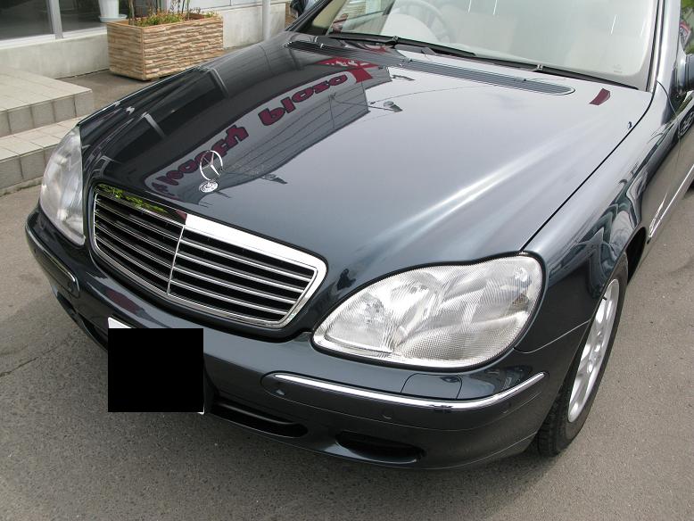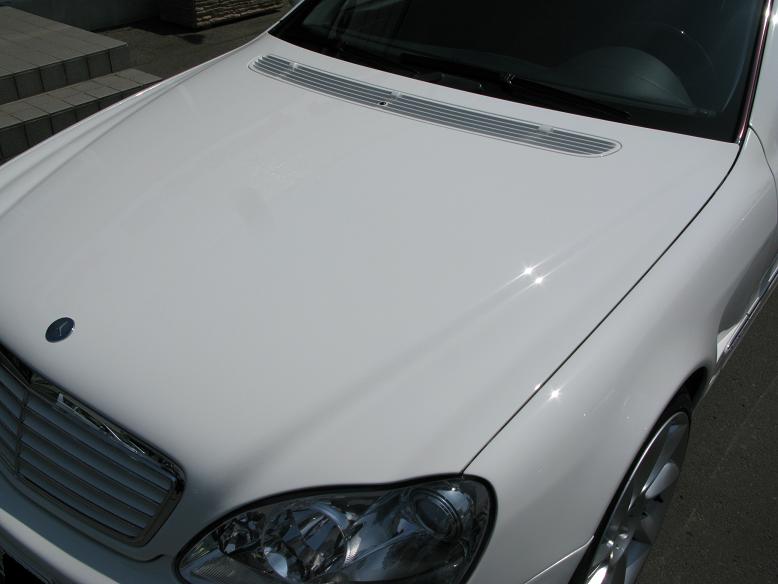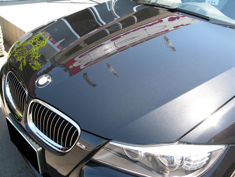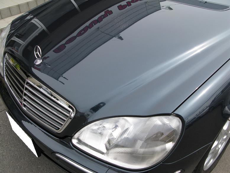 入庫した時に線傷や染みがあちこちありました、けれども、しっかり下地にして磨きをしまして、当社自慢ALPHA BLACKコーティングを塗りましたら~ボンネットの部分はこんなキラキラになりました