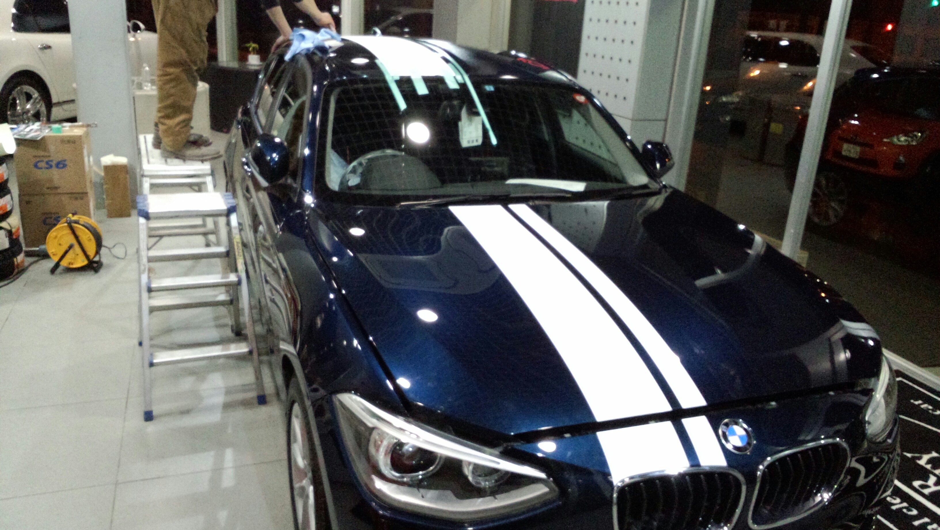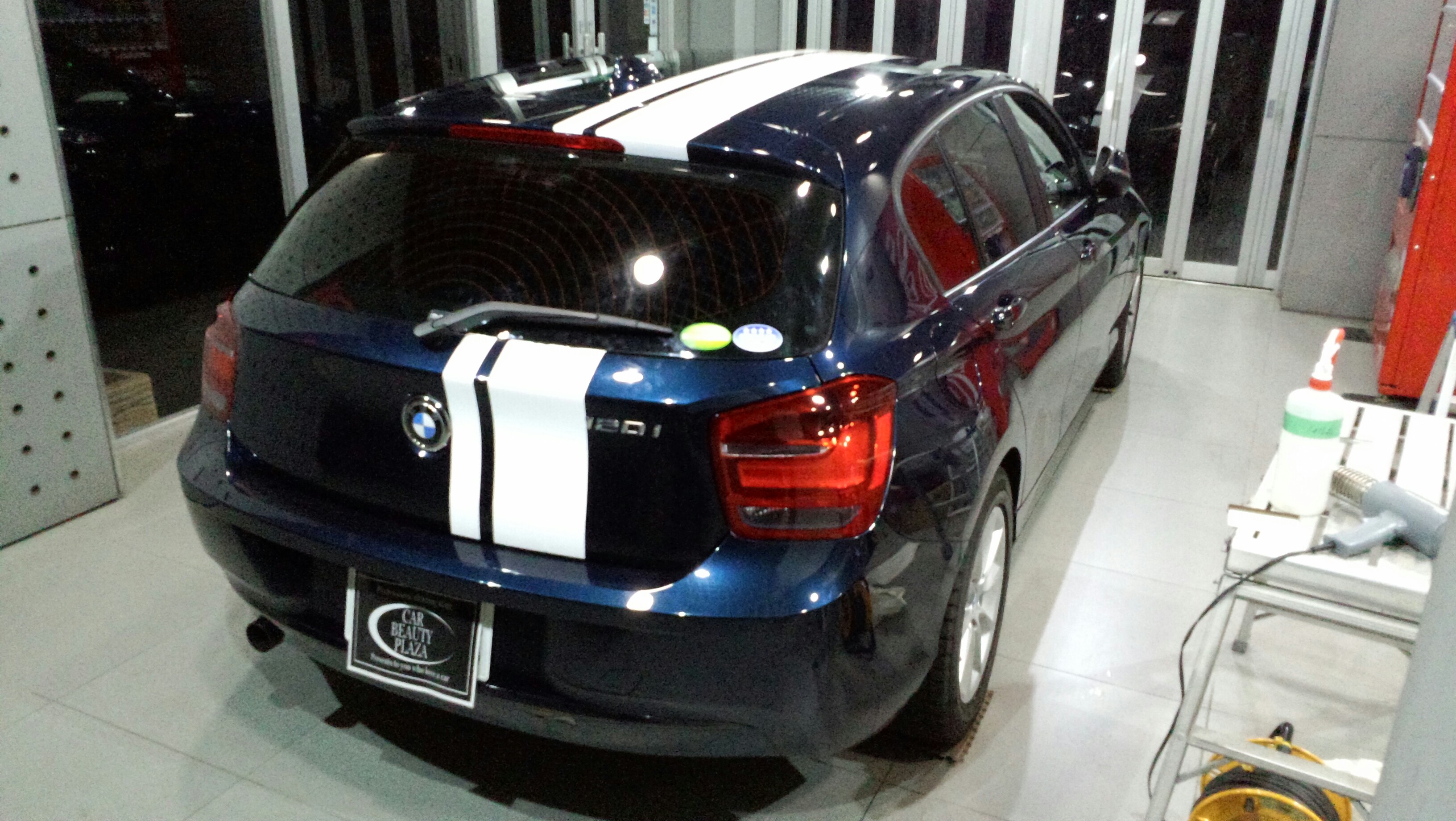 以前にアルファを施工していただいた『BMW 120i 』今回はレーシングストライプのラッピングで再入庫いたしました。