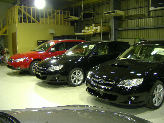 赤のアウトバック、黒のレガシィワゴン×2、黒のR2の計4台です。